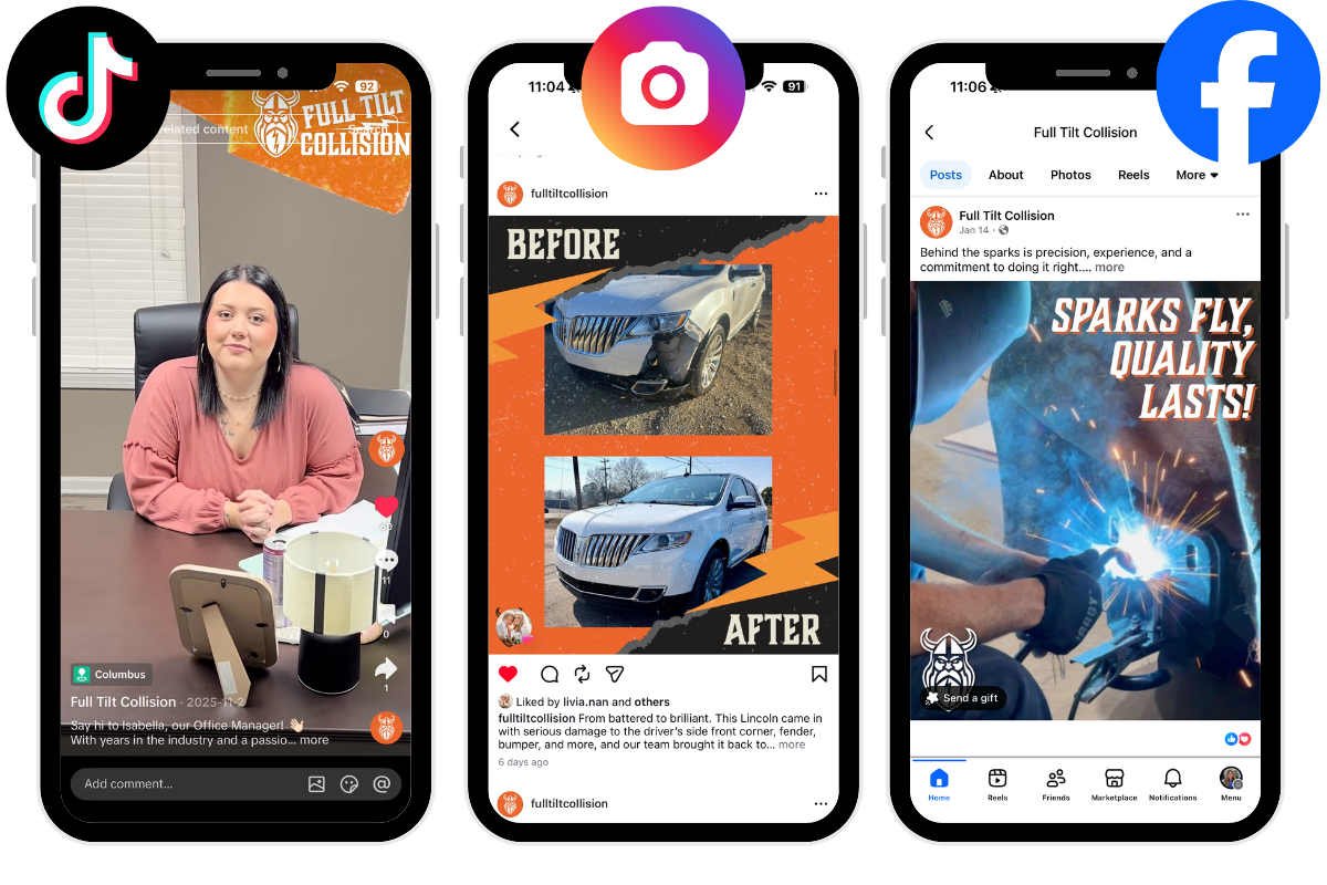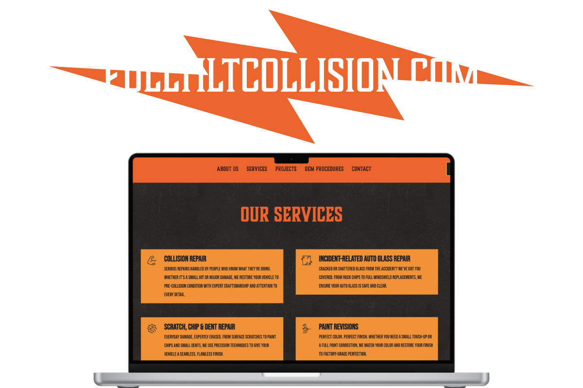 Digital engagement increased dramatically after launch, with social media views, interactions, and page visits all rising significantly. Today, Full Tilt Collision stands out in a crowded market with a confident, cohesive brand built for long-term growth.