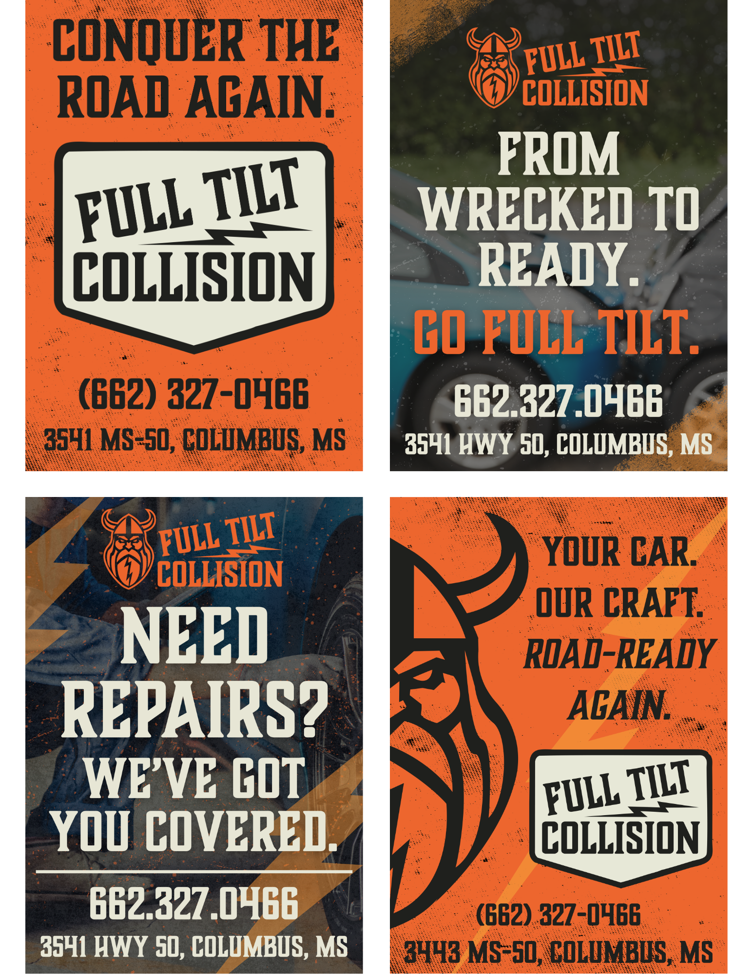 We led a full rebrand, starting with naming and brand positioning. The name Full Tilt Collision was chosen to represent an “all-in” approach to repairs and service. From there, we developed a bold visual identity centered around a Viking mascot—an intentional move away from the generic automotive imagery used by most competitors.
