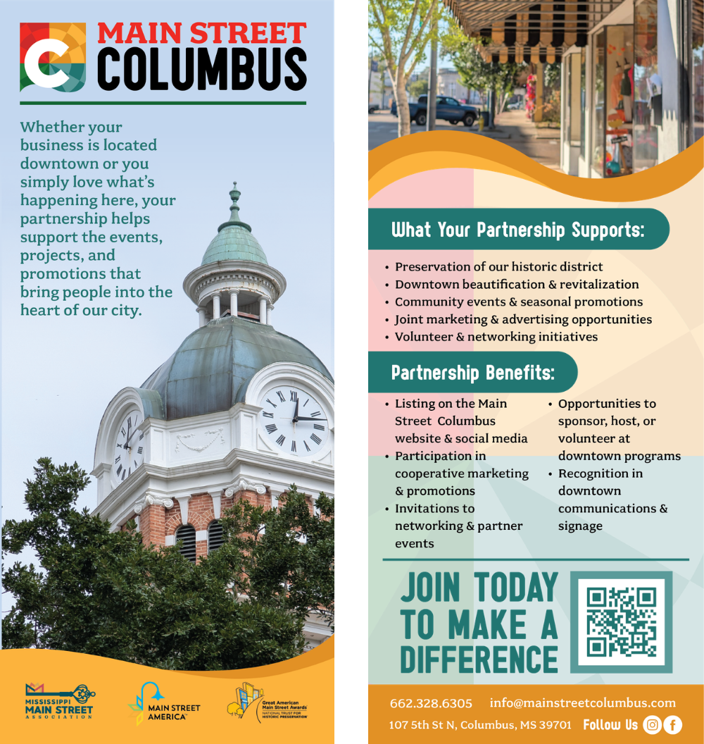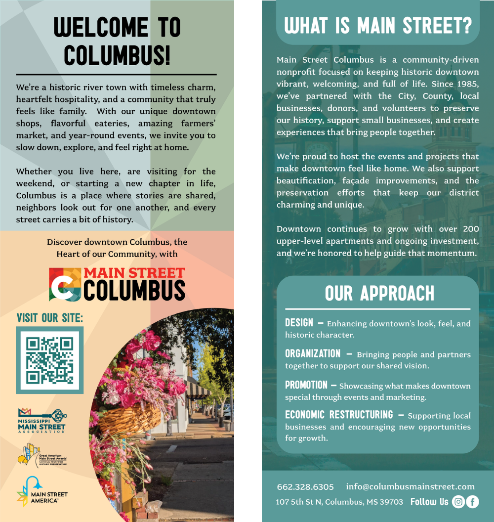 The final rack cards deliver versatile, professional materials that work across multiple touchpoints—from visitor centers to community spaces and partner outreach. They provide Columbus Main Street with polished, brand-aligned tools that support community growth, engagement, and long-term relationship building.