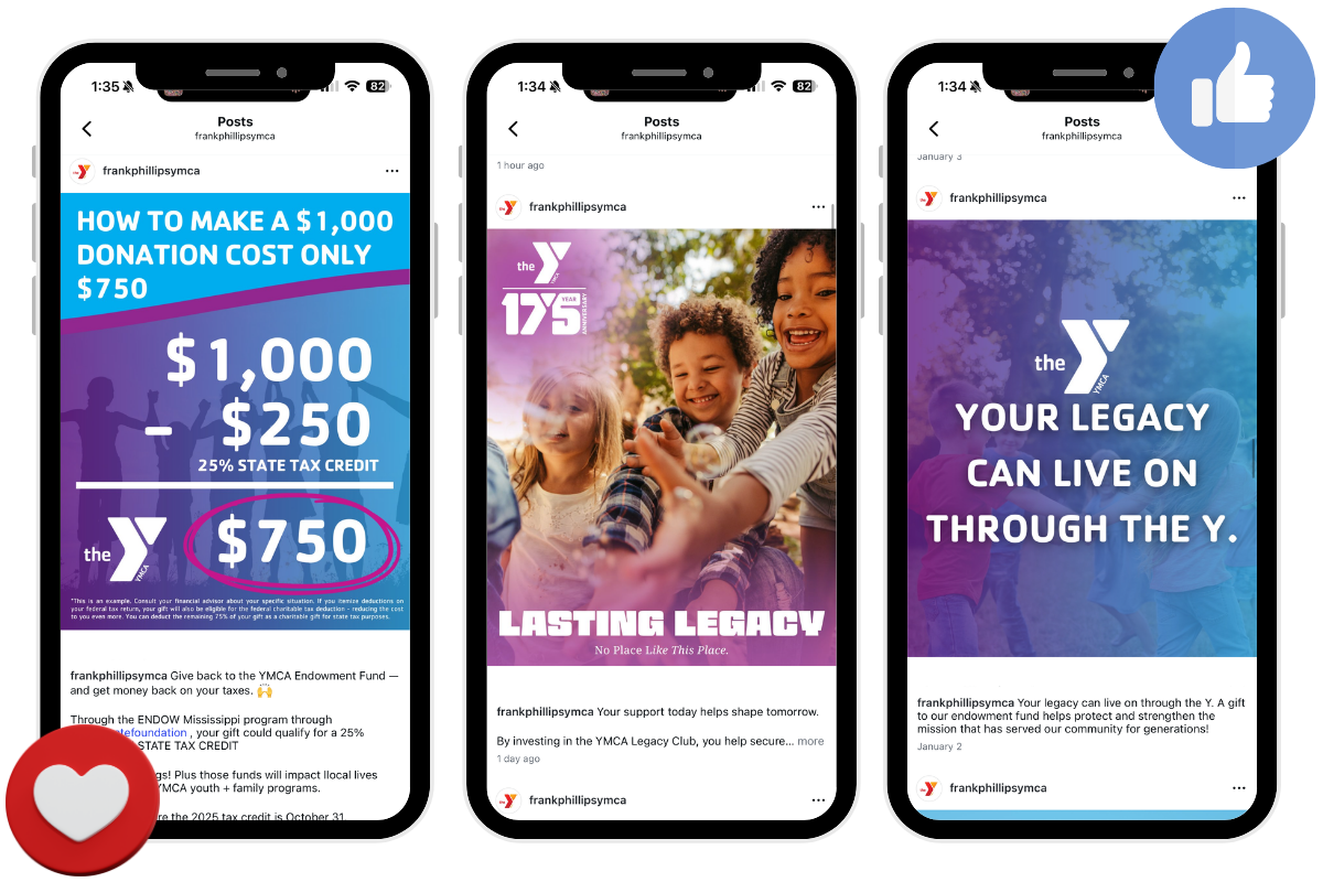 The campaign provided the YMCA with a unified toolkit to promote the Legacy Club across print, in-facility displays, and social media. The materials created a professional, consistent presence that makes it easier for staff to introduce the program and start conversations about legacy giving.
