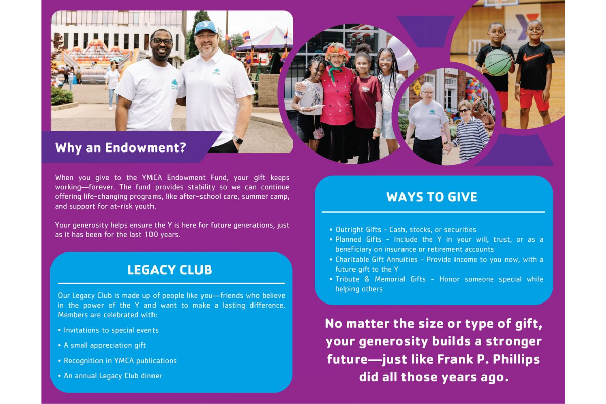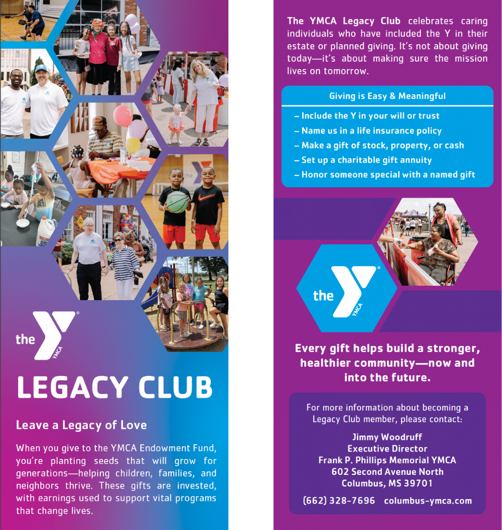 The Frank P. Phillips YMCA needed a cohesive set of materials to promote its Legacy Club, a program recognizing individuals who support the YMCA’s future through planned giving. The goal was to clearly communicate the program’s purpose while maintaining the trust and community-centered tone of the YMCA brand.